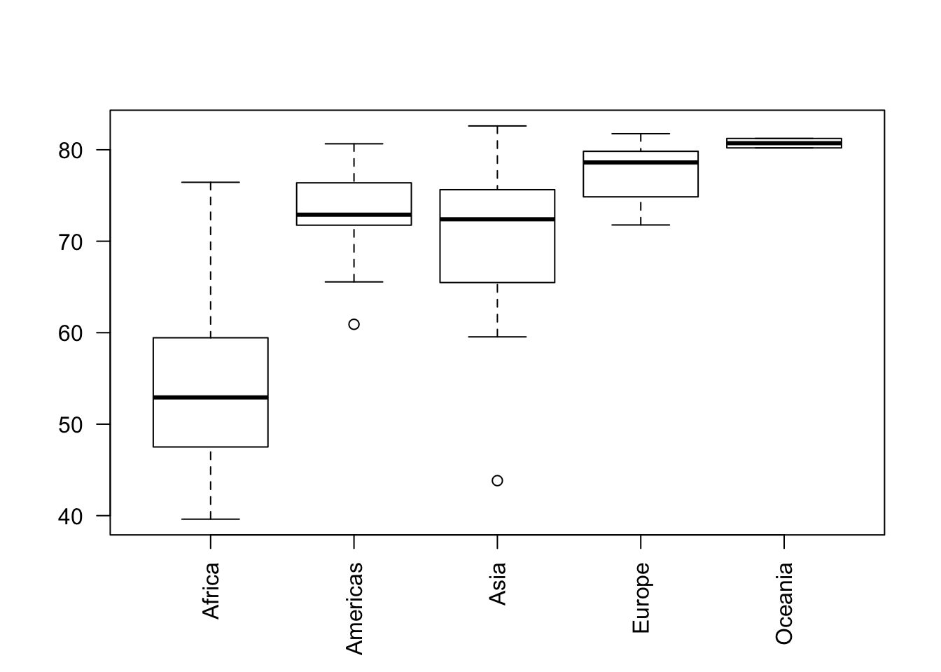 boxplot(lifeExp ~ continent, data=year2007, las=2)