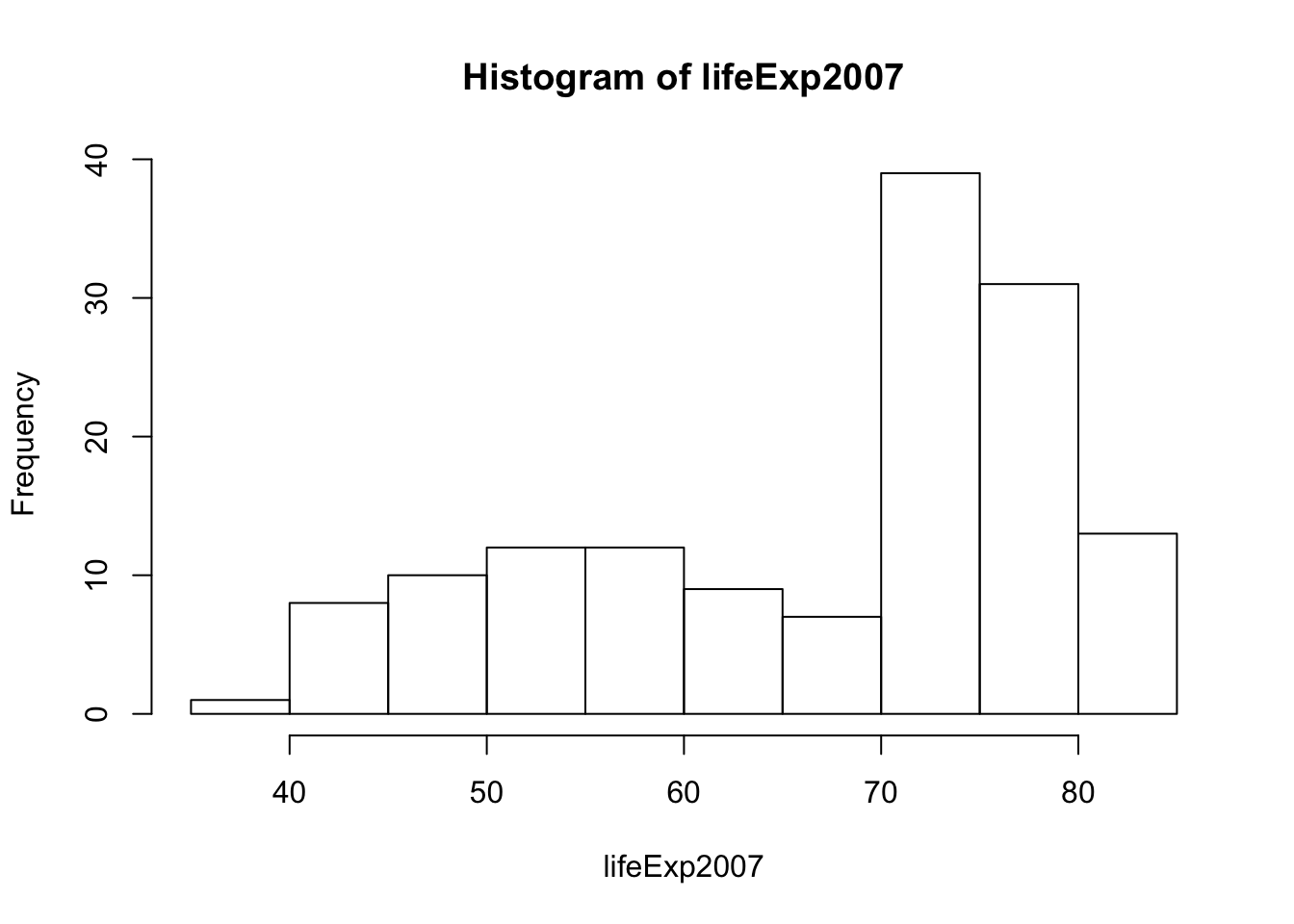 Plot a histogram of life expectancy in 2007 over all countries: