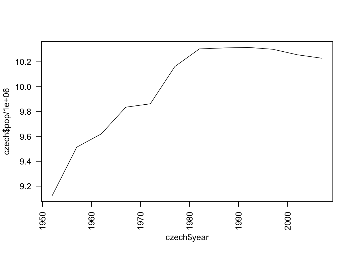 czech <- subset(gapminder, country == "Czech Republic")