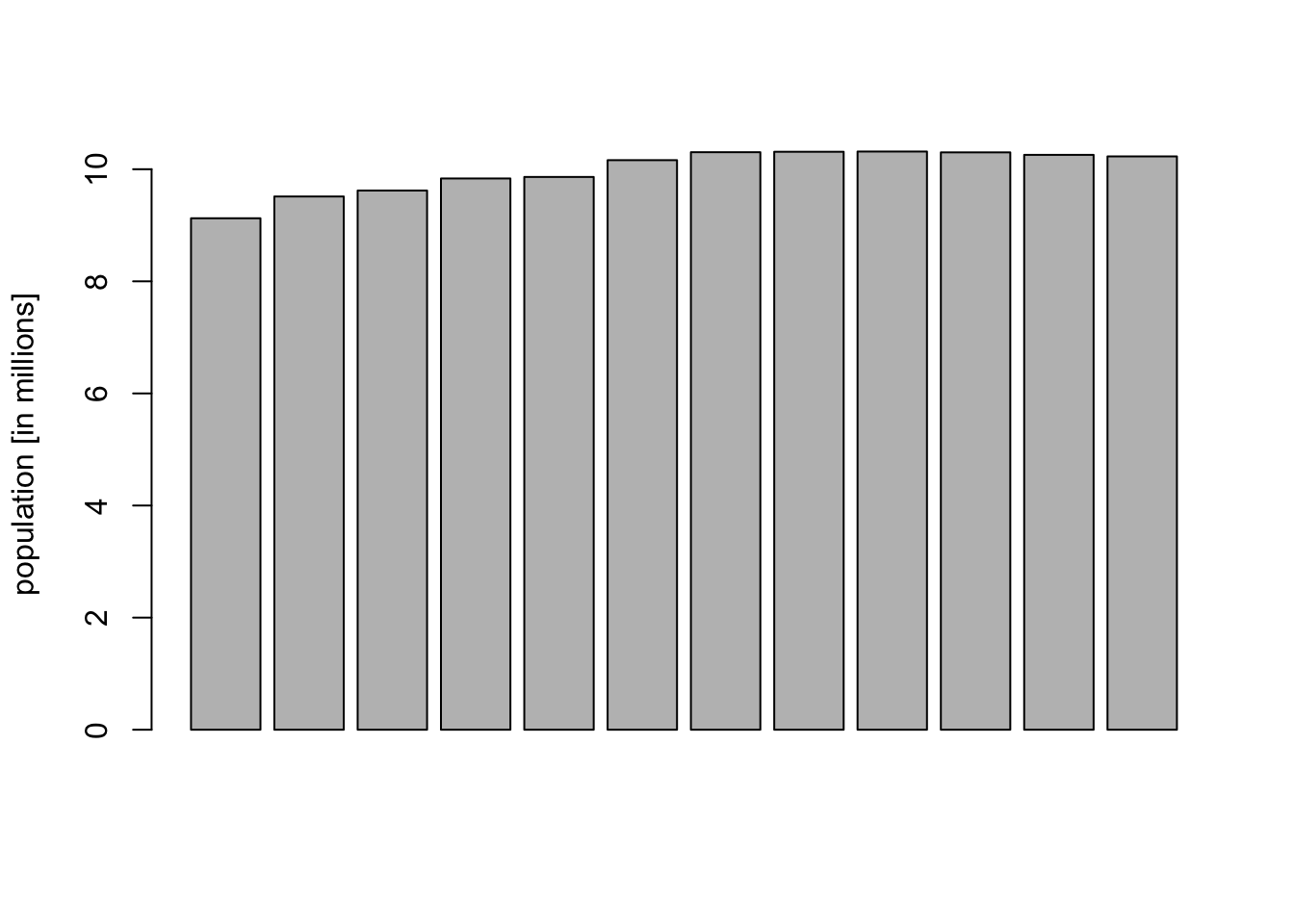 Visualize how the population of the Czech Republic grows by a line and a barplot. Which plot do you prefer?