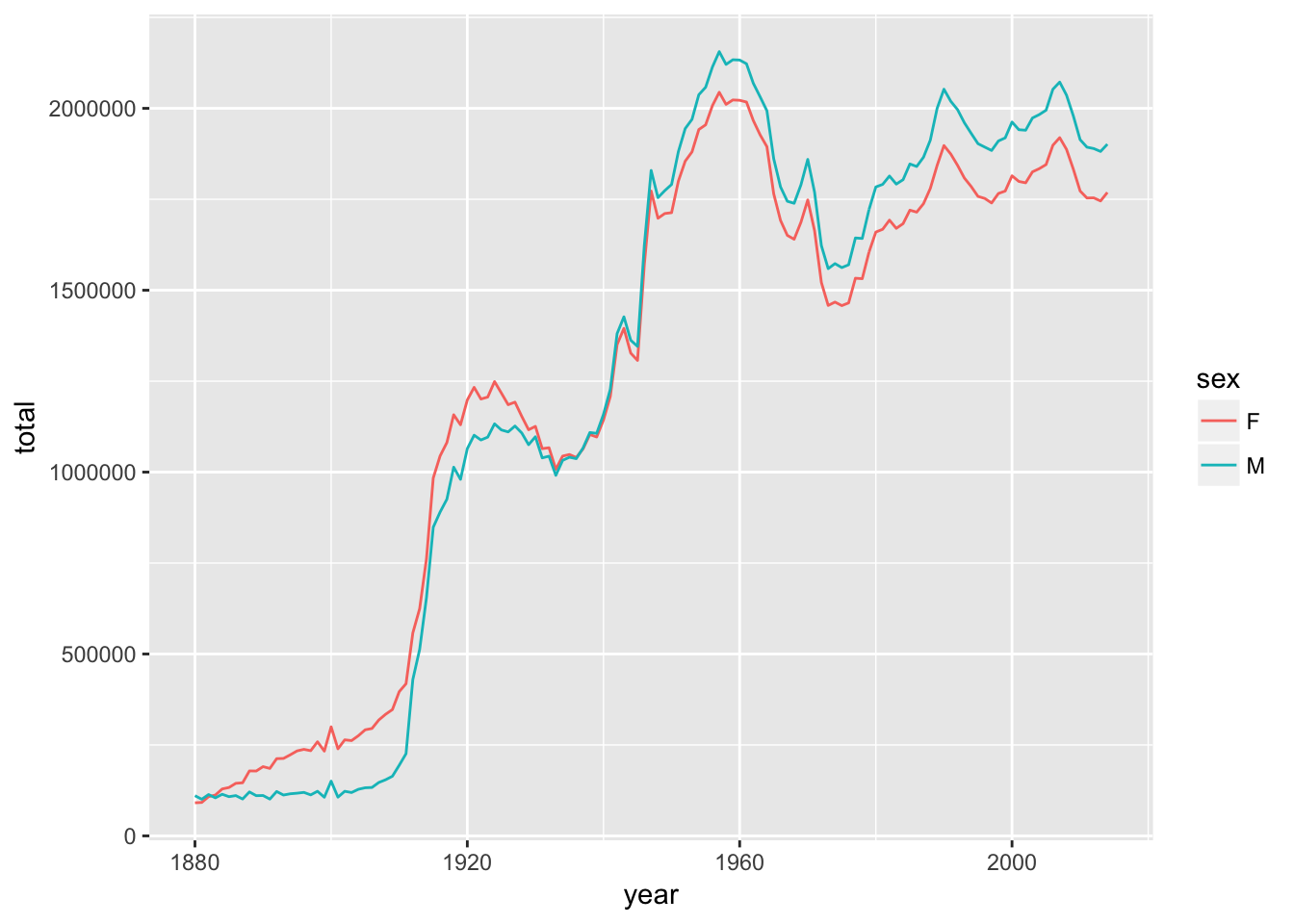 Install and load package babynames with names of male and female babies in US Social Security Administration (from 1880 to 2014).