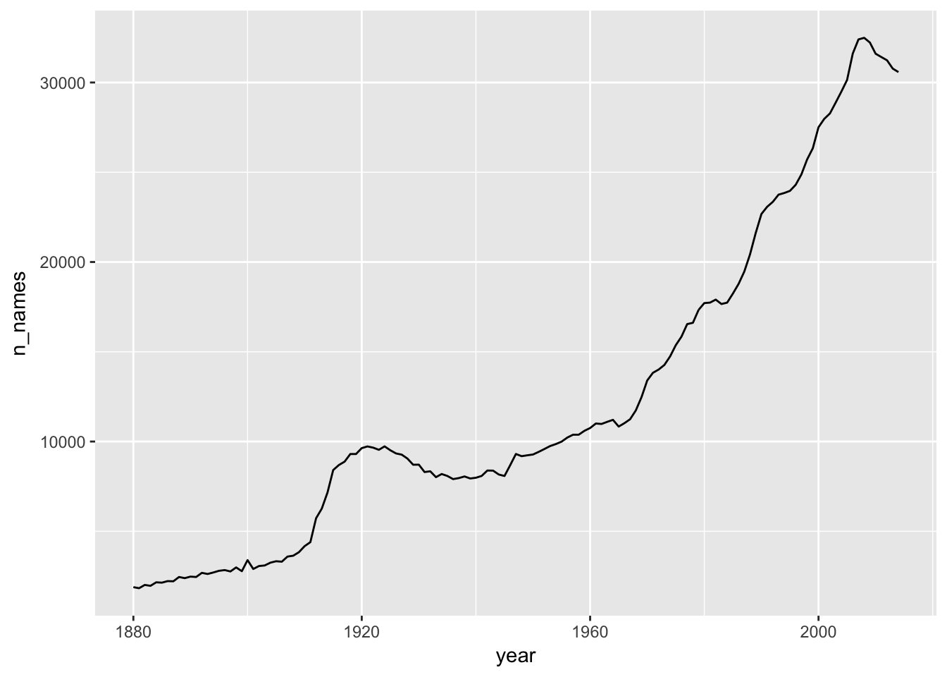 Plot the number of unique names by year over time. Does it change? (Note in English, the same name could be given to a boy and a girl at the same year)